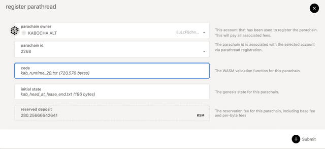 - registrar.forceRegister() - with the pure proxy account, standard 280.3KSM deposit (see below), paraid 2113, and the head hash and validation_code at the point where Kabocha stops making blocks (not yet known).