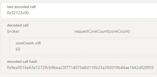 The call sends an XCM message to the Coretime chain to request 60 cores to be made available: 0x630003000100b50f03082f00000602fa5159b0017d1032123c00